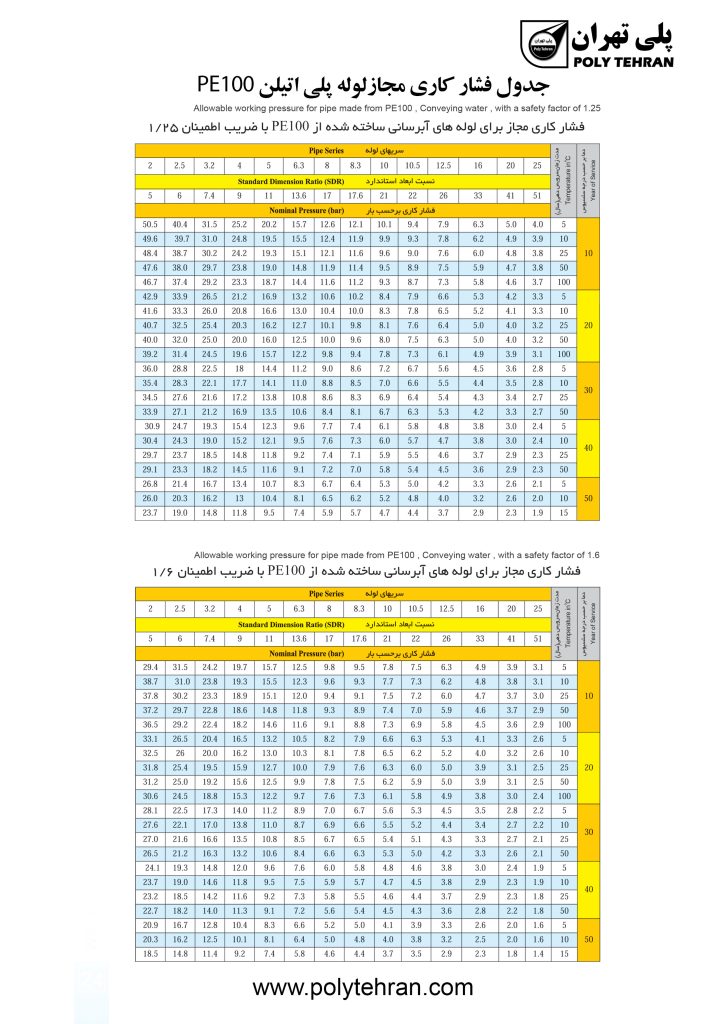 جدول فشار کاری لوله های پلی اتیلن پی ای 100