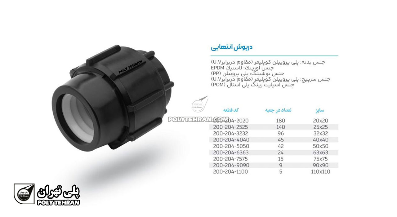 - درپوش انتهایی 40: درپوش انتهایی پلی اتیلن پیچی 40 میلیمتر (معادل 1/4 1 اینچ)
